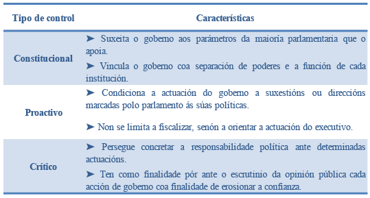 Deste xeito, o control persegue que o lexislativo impoña a súa vontade ao executivo, o condicione ou o someta ao escrutinio público28, tendo polo tanto unha vocación constitucional, proactiva ou crítica.