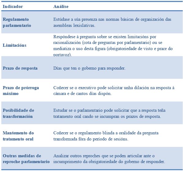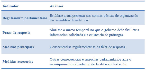 Para a súa análise, definíronse sete indicadores agrupados en tres grandes categorías de estudo: formal (blindaxe xurídica no regulamento parlamentario e existencia ou non de limitacións no seu exercicio), procedemental (prazo de resposta e mecanismos de prórroga) e mecanismos de reproche parlamentario (posibilidade de transformación en pregunta oral, tratamento da oralidade da pregunta convertida e outras medidas accesorias).