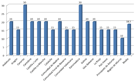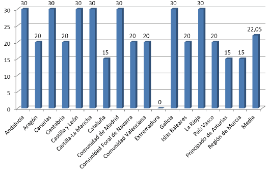 O prazo medio definido en todas as comunidades é de 18,5 días. Neste apartado a maioría dos regulamentos fixan 20 días como prazo de resposta. Dúas comunidades superan este prazo, sendo os 30 días que se prevén nos regulamentos do Parlamento de Canarias e a Asemblea de Estremadura o período de tempo máis amplo e os 10 días exixidos por parte do Regulamento da Asemblea Rexional de Murcia o prazo máis curto para que o executivo remita a súa resposta á cámara.