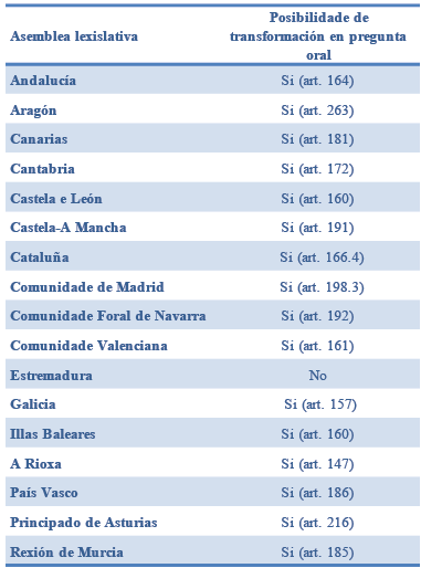 En todos eles se establece como reproche principal a posibilidade de transformar de forma oral a pregunta, destacando a existencia de mecanismos accesorios no Parlamento Vasco (requirir que se remita a resposta escrita á cámara) ou de Cataluña, onde a substanciación da iniciativa terá que realizarse dentro dos 30 días posteriores á súa transformación.