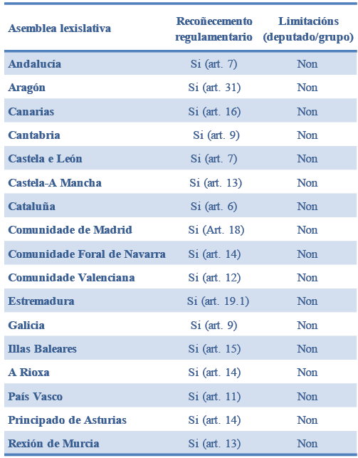 O seu estudo realizouse a partir da análise de catro indicadores. En primeiro lugar, estúdase a súa formalización xurídica nos regulamentos parlamentarios como un dereito.