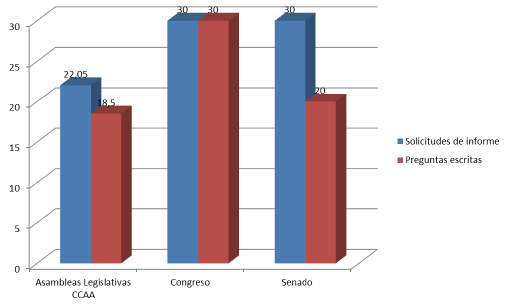 Deste xeito, defínese a obrigatoriedade de que os gobernos autonómicos respondan nun menor prazo de tempo tanto ás preguntas escritas (18,5 días de media, fronte aos 30 do Congreso e os 20 do Senado) como ás solicitudes de informe (22,05 días de media nos 17 parlamentos autonómicos, fronte aos 30 das dúas cámaras do lexislativo a nivel nacional).
