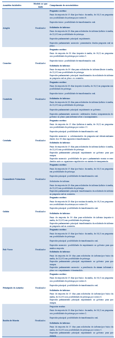 Adicionalmente, deseñáronse en moitos casos instrumentos coactivos para exixir o cumprimento das iniciativas de control escrito. Neste sentido, como se ve nas táboas ١2 e 13, é significativo que, xunto co tradicional reproche parlamentario que permite a transformación oral das preguntas escritas, coa excepción de Estremadura, apreciable na táboa 8, en 3 das 17 asembleas lexislativas existen mecanismos de reproche complementario, como é o requirimento da presidencia do lexislativo vasco da posibilidade de publicar a pregunta non contestada no portal de transparencia da cámara madrileña ou o prazo máximo de substanciación do Parlamento catalán.