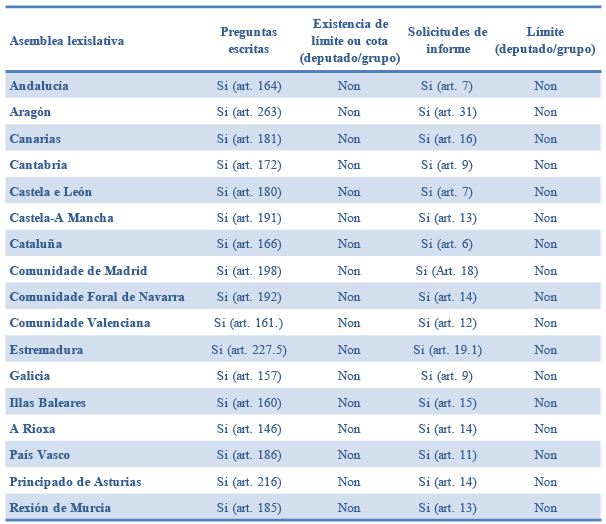 Como se pode observar desde unha perspectiva formal de análise, os 17 parlamentos autonómicos consideran a posibilidade de que os seus integrantes formulen preguntas con resposta escrita ao Consello de Goberno e así o dispón nos seus respectivos regulamentos.