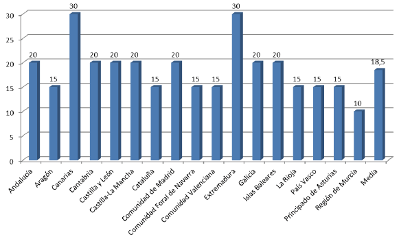 El plazo medio definido en todas las comunidades es de 18,5 días. En este apartado la mayoría de los reglamentos fijan 20 días como plazo de respuesta. Dos comunidades superan este plazo, siendo los 30 días que se prevén en los reglamentos del Parlamento de Canarias y la Asamblea de Extremadura el periodo de tiempo más amplio, y los 10 días exigidos por parte del Reglamento de la Asamblea Regional de Murcia el plazo más corto para que el ejecutivo remita su respuesta a la cámara.