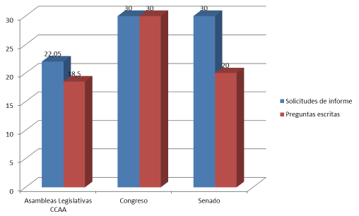 De este modo, se define la obligatoriedad de que los gobiernos autonómicos respondan en un menor plazo de tiempo tanto a las preguntas escritas (18,5 días de media, frente a los 30 del Congreso y los 20 del Senado) como a las solicitudes de informe (22,05 días de media en los 17 parlamentos autonómicos, frente a los 30 de las dos cámaras del legislativo a nivel nacional).