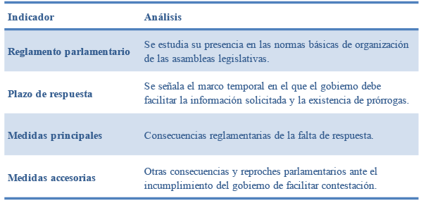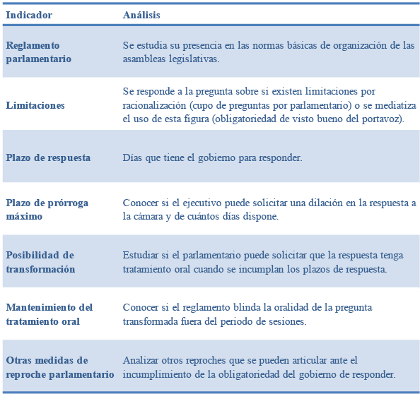 Para su análisis, se han definido siete indicadores agrupados en tres grandes categorías de estudio: formal (blindaje jurídico en el reglamento parlamentario y existencia o no de limitaciones en su ejercicio), procedimental (plazo de respuesta y mecanismos de prórroga) y mecanismos de reproche parlamentario (posibilidad de transformación en pregunta oral, tratamiento de la oralidad de la pregunta convertida y otras medidas accesorias).