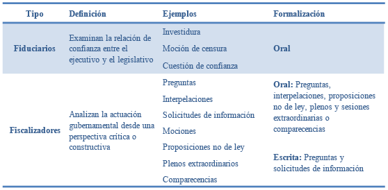 Su materialización funcional se traduce en un conjunto de figuras políticas contempladas en los diferentes reglamentos parlamentarios y que se pueden sistematizar en dos grandes grupos de mecanismos: fiduciarios y fiscalizadores.
