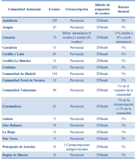 Por tanto, el desarrollo institucional autonómico ha conllevado la creación de 17 parlamentos en los que hay una composición dispar que oscila entre los 33 escaños del Parlamento de La Rioja y los 136 de la Asamblea de Madrid. En la totalidad de las asambleas legislativas los escaños se asignan mediante el empleo del sistema D’Hondt y en la mayoría se utiliza la provincia o la isla como circunscripción electoral (excepto Asturias, que divide la provincia en 3 distritos electorales, y Canarias, que creó en 2018 una circunscripción autonómica) y la definición de una barrera electoral casi siempre basada en la circunscripción provincial (con las excepciones de Canarias, Comunidad Valenciana y Extremadura, que la elevan en algunos casos a la comunidad autónoma) con porcentajes que oscilan entre el 3 % y el 5 %.