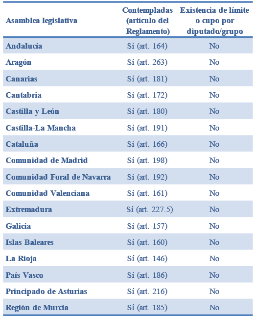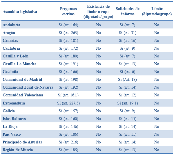 Como se puede observar desde una perspectiva formal de análisis, los 17 parlamentos autonómicos contemplan la posibilidad de que sus integrantes formulen preguntas con respuesta escrita al Consejo de Gobierno y así lo disponen en sus respectivos reglamentos.