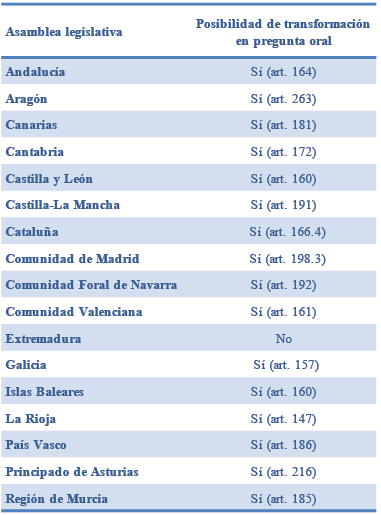 En todos ellos se establece como reproche principal la posibilidad de transformar de forma oral la pregunta, destacando la existencia de mecanismos accesorios en el Parlamento Vasco (requerir que se remita la respuesta escrita a la cámara) o de Cataluña, en donde la sustanciación de la iniciativa tendrá que realizarse dentro de los 30 días posteriores a su transformación.