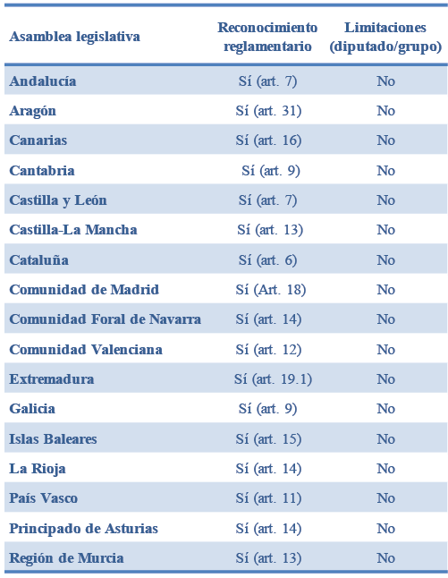 Su estudio se ha realizado a partir del análisis de cuatro indicadores. En primer lugar, se estudia su formalización jurídica en los reglamentos parlamentarios como un derecho.