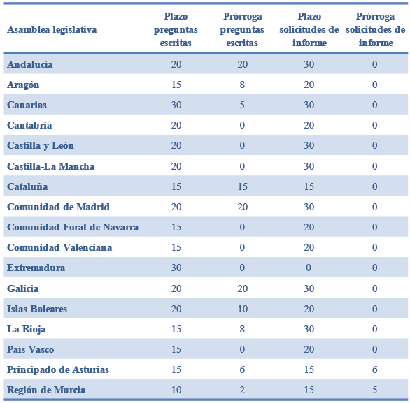 Es relevante señalar que el Parlamento de Cantabria, las Cortes Valencianas, de Castilla y León, de Castilla-La Mancha, la Asamblea de Extremadura y el Parlamento Vasco impiden a sus respectivos consejos de gobierno establecer ninguna prórroga al plazo máximo de respuesta establecido en sus reglamentos. Por su parte, Andalucía, la Comunidad de Madrid y Galicia facultan a sus ejecutivos a prorrogar por hasta 20 días la remisión de la respuesta parlamentaria, mientras que los parlamentos del Principado de Asturias (6 días), Canarias (5 días) y, sobre todo, la Región de Murcia (2 días) establecen los plazos más cortos de prórroga en la remisión de la respuesta.