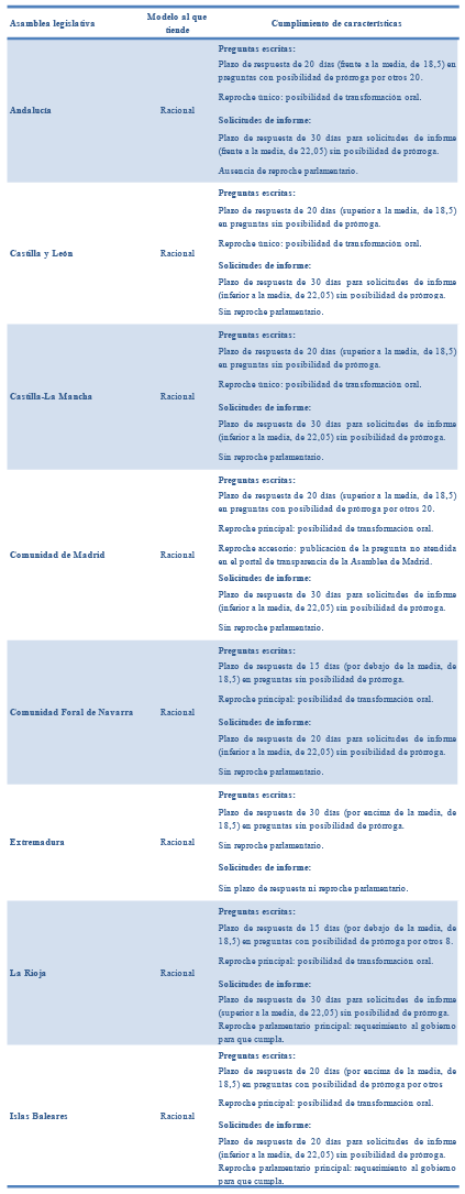 La segunda conclusión que se puede extraer de la presente investigación radica en que el refuerzo de los mecanismos de control escrito implica que la afirmación general analizada en la revisión de la literatura de que el parlamentarismo autonómico ha sido esencialmente isomórfico respecto del modelo a nivel estatal no es del todo cierta, ya que en la regulación de este tipo de figuras tanto las asambleas legislativas que diseñan un sistema de corte racional como las que definen un modelo con un claro carácter fiscalizador mejoran, en líneas generales, el tratamiento de las preguntas parlamentarias con respuesta escrita y el derecho de los miembros del poder legislativo de solicitar información a los gobiernos autonómicos.