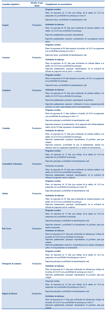 Sin embargo, el aspecto más relevante, que en todos estos modelos favorece la posición del parlamentario, consiste en el carácter que se da a las solicitudes de informe. Si bien en los nueve parlamentos autonómicos, cuyo control escrito tiende al modelo fiscalizador, se establecen plazos dispares que oscilan entre los 15 y los 30 días, lo relevante es que se definen mecanismos principales o accesorios de reproche parlamentario para cuando tengan lugar casos de incumplimiento que se traducen en tres importantes consecuencias.