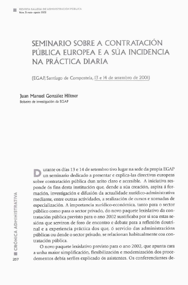 - Juan Manuel González Hiltner, Xornadas sobre o novo regulamento da lei de contratos das administracións públicas , Revista Galega de Administración Pública: Vol. 1 Núm. 32 (2002)