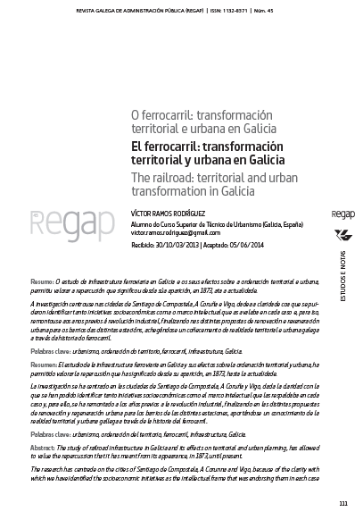 O estudo da infraestrutura ferroviaria en Galicia e os seus efectos sobre a ordenación territorial e urbana, permitiu valorar a repercusión que significou desda súa aparición, en 1873, ata a actualidade.A investigación centrouse nas cidades de Santiago de Compostela, A Coruña e Vigo, dadea a claridade coa que se puideron identificar tanto iniciativas socioeconómicas coma o marco intelectual que as avalaba en cada caso e, para iso, remontouse aos anos previos á revolución industrial, finalizando nas distintas propostas de renovación e rexeneración urbana para os barrios das distintas estacións, achegándose un coñecemento da realidade territorial e urbana galega a través da historia do ferrocarril.