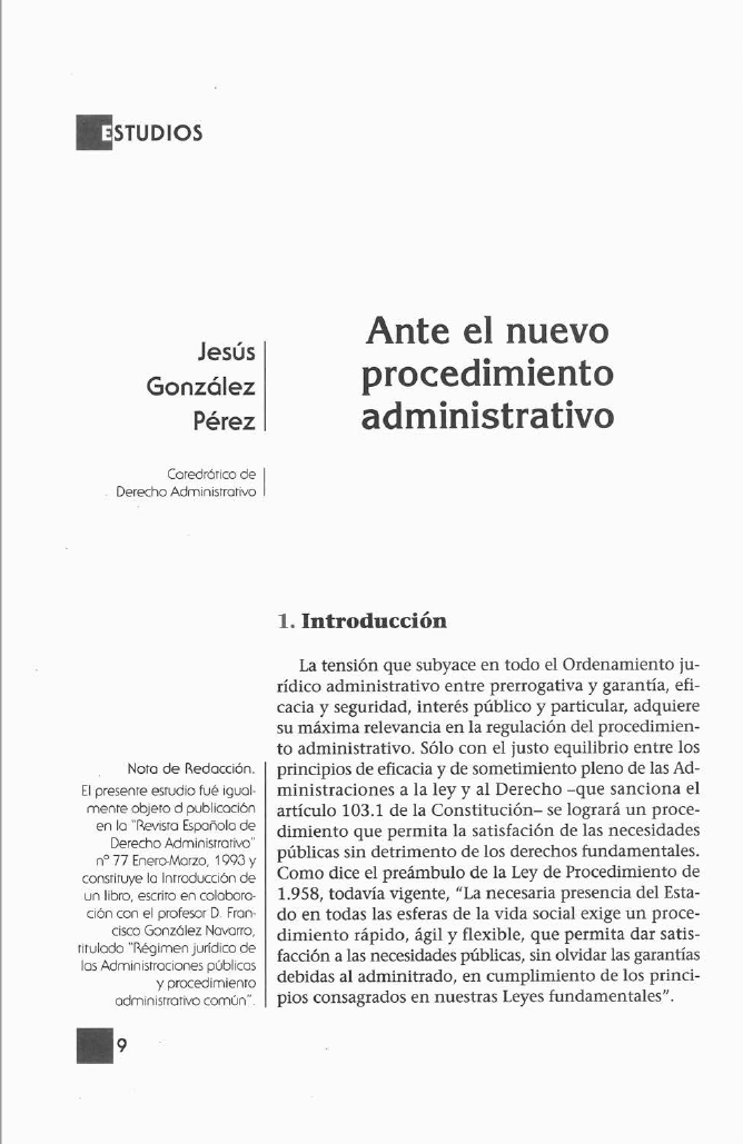 O autor fai unha confrontación do texto (procedemento administrativo) coa normativa constitucional que consagra os dereitos fundamentais, algúns dos cales constitúen auténticos principios xerais do Dereito dende catro perspectivas que son: o acceso ao procedemento, unha vez no procedemento, verificando se se respetan as elementais garantías de defensa, acabado o procedemento, comprobando ata que punto a decisión está investida da eficacia que dimana do principio de seguridade xurídica e se o procedemento non constitúe un obstáculo á tutela xudicial efectiva.