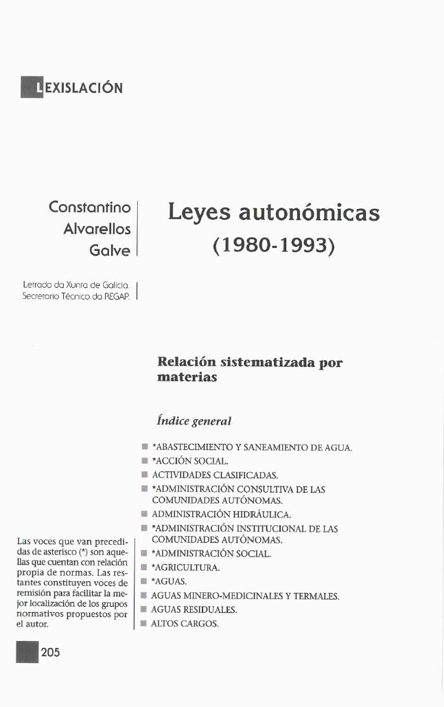 Neste artigo enuméranse as diferentes leis autonómicas clasificadas por materias