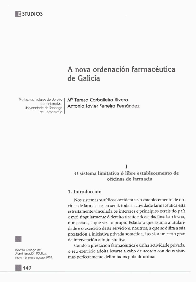 Toda actividade farmacéutica está estrictamente vinculada ós intereses do país e moi singularmente ó dereito á saúde dos cidadáns, por iso, nuns casos, é o propio Estado o que asume a titularidade e o exercicio deste servicio e, noutros, a que se difira a súa prestación á iniciativa privada sometida a un certo grao de intervención administrativa.