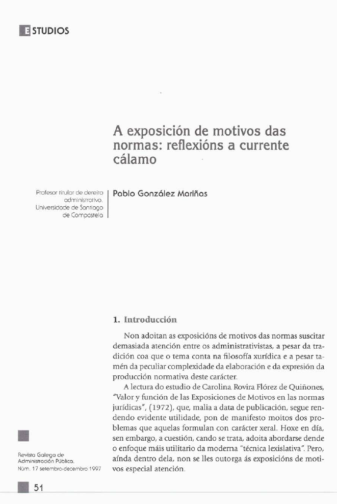 As exposicións de motivos das normas non suscitan gran atención entre os administrativos polo que dificilmente resulta superflua e ata unha obriga ó poder explicarse ou xustificarse e sempre constitúe un achegamento interpretativo útil.