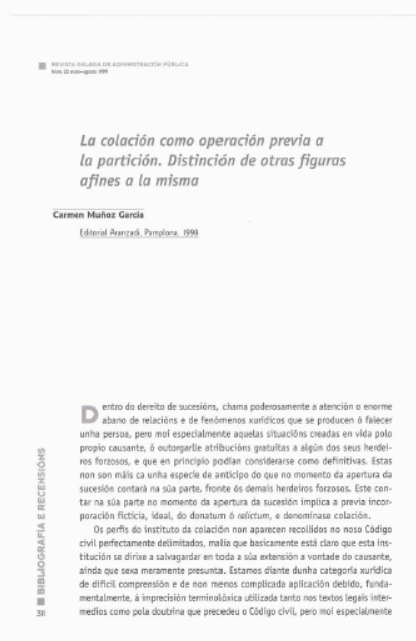 Dentro do dereito de sucesións, chama poderosamente a atención o enorme abano de relacións e de fenómenos xurídicos que se producen ó falecer unha persoa, pero moi especialmente aquelas situacións creadas en vida polo propio causante, ó outorgarlle atribucións gratuítas a algún dos seus herdeiros forzosos, e que en principio podían considerarse como definitivas. Estas non son máis ca unha especie de anticipo do que no momento da apertura da sucesión contará na súa parte, fronte ós demais herdeiros forzosos. Este contar na súa parte no momento da apertura da sucesión implica a previa incorporación ficticia, ideal , do donatum ó relictum, e denomínase colación.