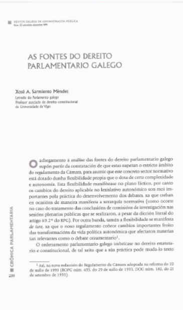 - Xosé A. Sarmiento Méndez, Os grupos parlamentarios no dereito parlamentario galego , Revista Galega de Administración Pública: Vol. 1 Núm. 14 (1996)