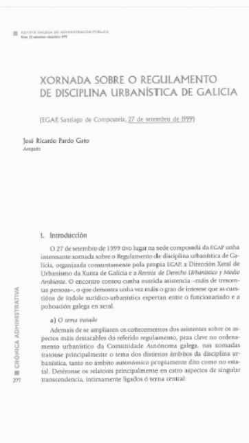 O 27 de setembro de 1999 tivo lugar na sede compostelá da EGAP unha interesante xornada sobre o Regulamento de disciplina urbanística de Galicia, organizada conxuntamente pola propia EGAP, a Dirección Xeral de Urbanismo da Xunta de Galicia e a Revista de Derecho Urbanístico y Medio Ambiente. 0 encontro contou cunha nutrida asistencia -máis de trescentas persoas-, o que demostra unha vez máis o grao de interese que as cuestións de índole xurídico-urbanística espertan entre o funcionariado e a poboación galega en xeral.