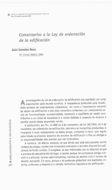 A promulgación da Lei de ordenación da edificación era agardada con certa expectación polo mundo xurídico. A inquedanza producida pola mobilidade extrema do ordenamento urbanístico, así como a importancia crecente do sector da edificación e das súas conexións evidentes cun compromiso social de funcionalidade, economicidade, harmonía e equilibrio do medio contribuíron a un clima de esperanza e a certas dúbidas ó respecto do alcance e posible acerto desta anunciada norma. ‘O ri) A publicación, por fin, no BOE do 6 de novembro, da Lei 38/1999, do 5 de novembro, de ordenación da edificación, desvelou as incógnitas producidas.
