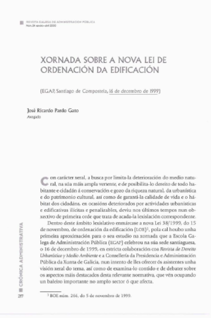 - José Ricardo Pardo Gato, Xornada sobre o regulamento de disciplina urbanística de Galicia , Revista Galega de Administración Pública: Vol. 1 Núm. 23 (1999)