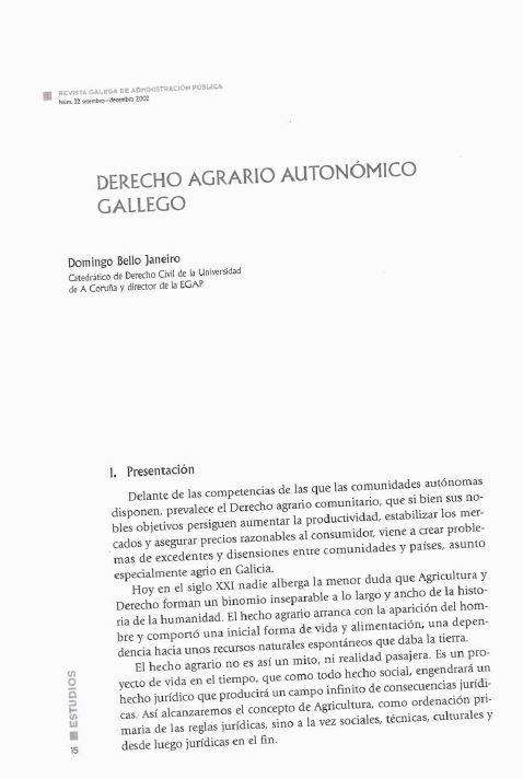 - Domingo Bello Janeiro, O dereito agrario galego , Revista Galega de Administración Pública: Vol. 1 Núm. 38 (2004)