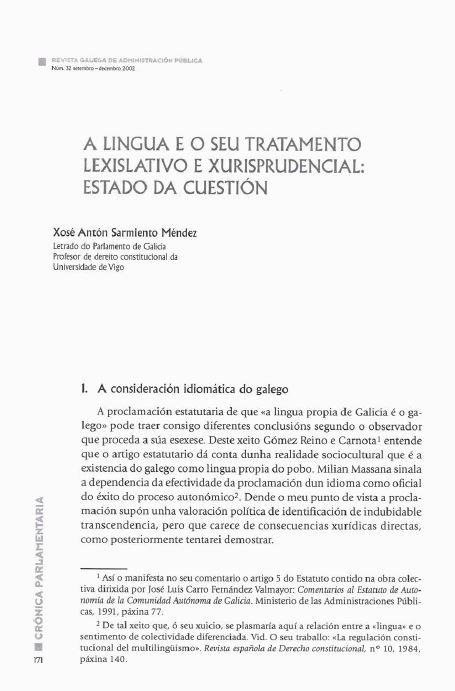 - Xosé Antón Sarmiento Méndez, Notas sobre a natureza e composición da Xunta de Galicia á luz da xurisprudencia constitucional , Revista Galega de Administración Pública: Vol. 1 Núm. 34 (2003)