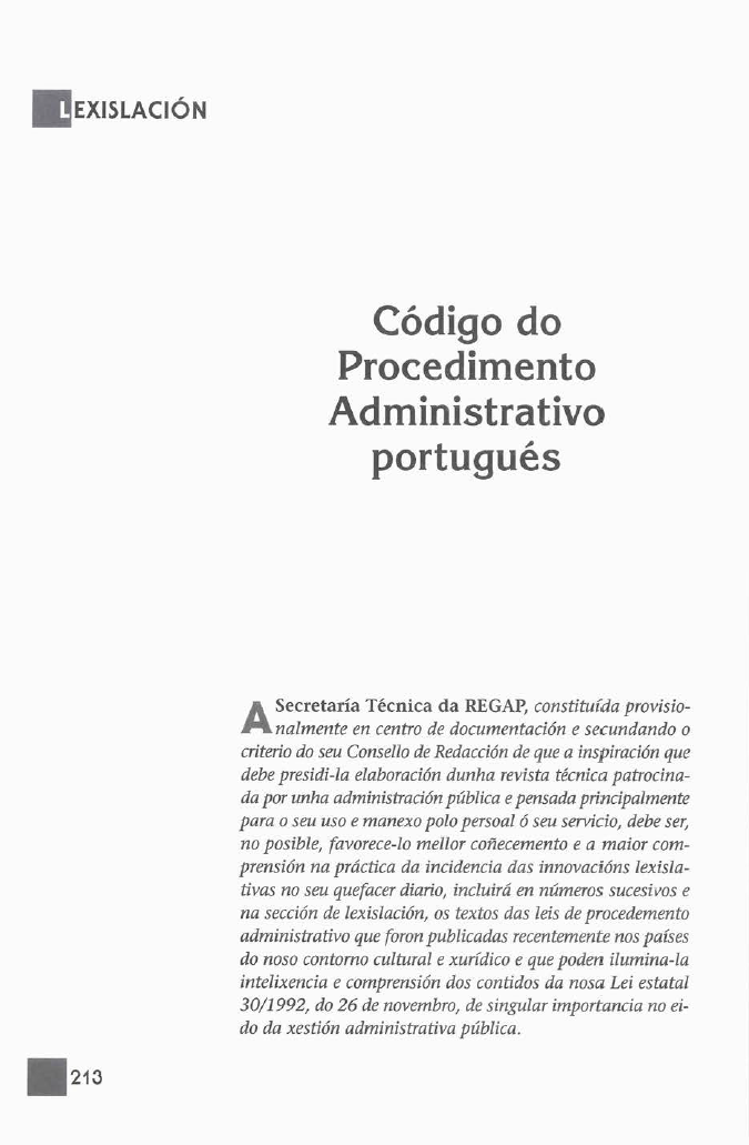 Neste artigo, fálase do Código do Procedimento Adminitrativo Portugués que presenta unha dificil e equilibrada síntese entre as garantías e seguridade xurídicas e a eficacia administrativa en Portugal.
