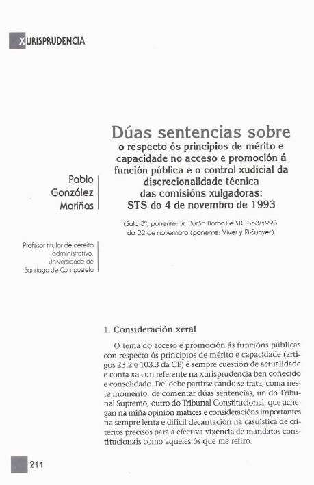 Dúas sentencias sobre o respecto ós principios de mérito e capacidade no acceso e promoción á función pública e o control xudicial da discrecionalidade técnica das comisións xulgadoras: STS do 4 de novembro de 1993