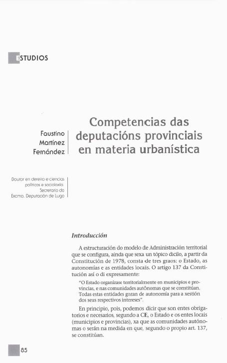 A estructuración do modelo de Administración territorial que se configura, a partir da Constitución de 1978, consta de tres graos: o Estado, as autonomías e as entidades locais gozando todas elas de autonomía para a xestión dos seus intereses. Neste artigo o autor vaise centrar nas competencias das deputacións provinciais en materia urbanística; analizando os seus presentes e tamén o futuro das mesmas.