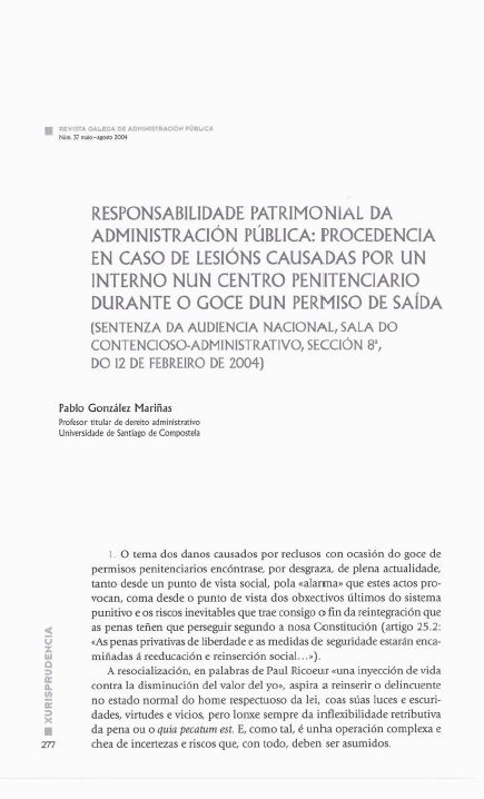 A sentenza da Audiencia Nacional do 12 de febreiro de 2004 aborda o tema dos danos causados por reclusos con ocasión do goce de permisos penitenciarios. Recoñecendo no caso a procedencia da responsabilidade patrimonial da Administración e consagrando unha significativa doutrina en varios aspectos.