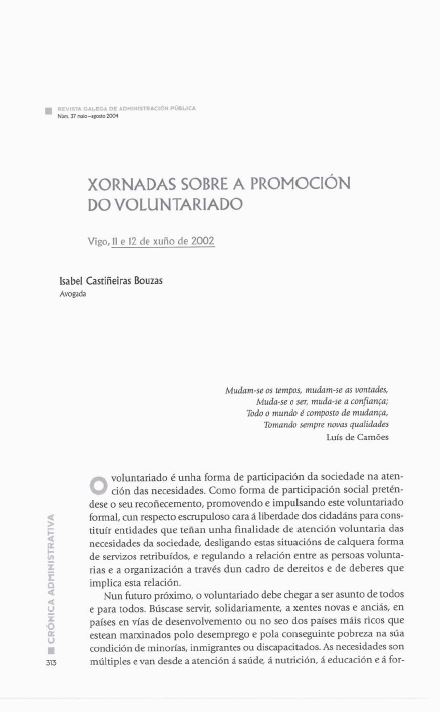 - Isabel Castiñeiras Bouzas, Xornadas sobre o municipio desde a perspectiva do século XXI , Revista Galega de Administración Pública: Vol. 1 Núm. 35 (2003)