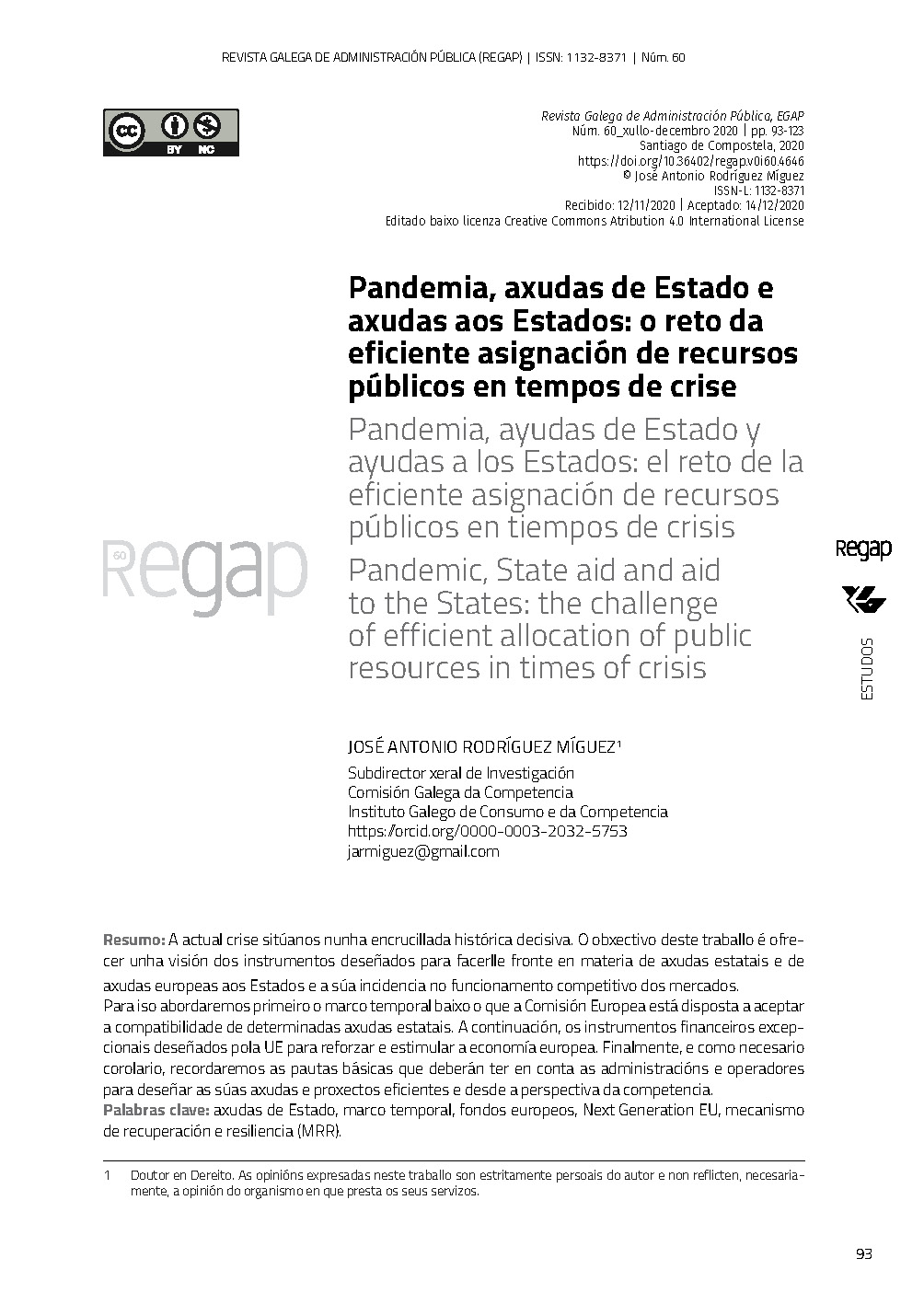 RODRÍGUEZ MÍGUEZ, J.A., “Ayudas de estado para tiempos de crisis: la necesidad de flexibilidad, eficiencia y control”, Anuario de la Competencia 2020, Fundación ICO, Marcial Pons, Madrid, 2020 (en prensa).