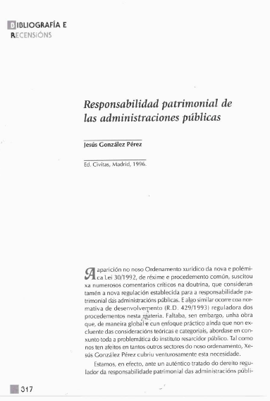 A aparición no noso Ordenamento xurídico da nova e polémica Lei 30/1992, de réxime e procedemento común, suscitou xa numerosos comentarios críticos na doutrina, que consideran tamén a nova regulación establecida para a responsabilidade patrimonial das administracións públicas. E algo similar ocorre coa normativa de desenvolvemento (R.D. 429/1993) reguladora dos procedementos nesta materia. Faltaba, sen embargo, unha obra que, de maneira global e cun enfoque práctico aínda que non excluinte das consideracións teóricas e categoriais, abordase en conxunto toda a problemática do instituto resarcidor público. Tal como nos ten afeitos en tantos outros sectores do noso ordenamento, Xesús González Pérez cubriu venturosamente esta necesidade.