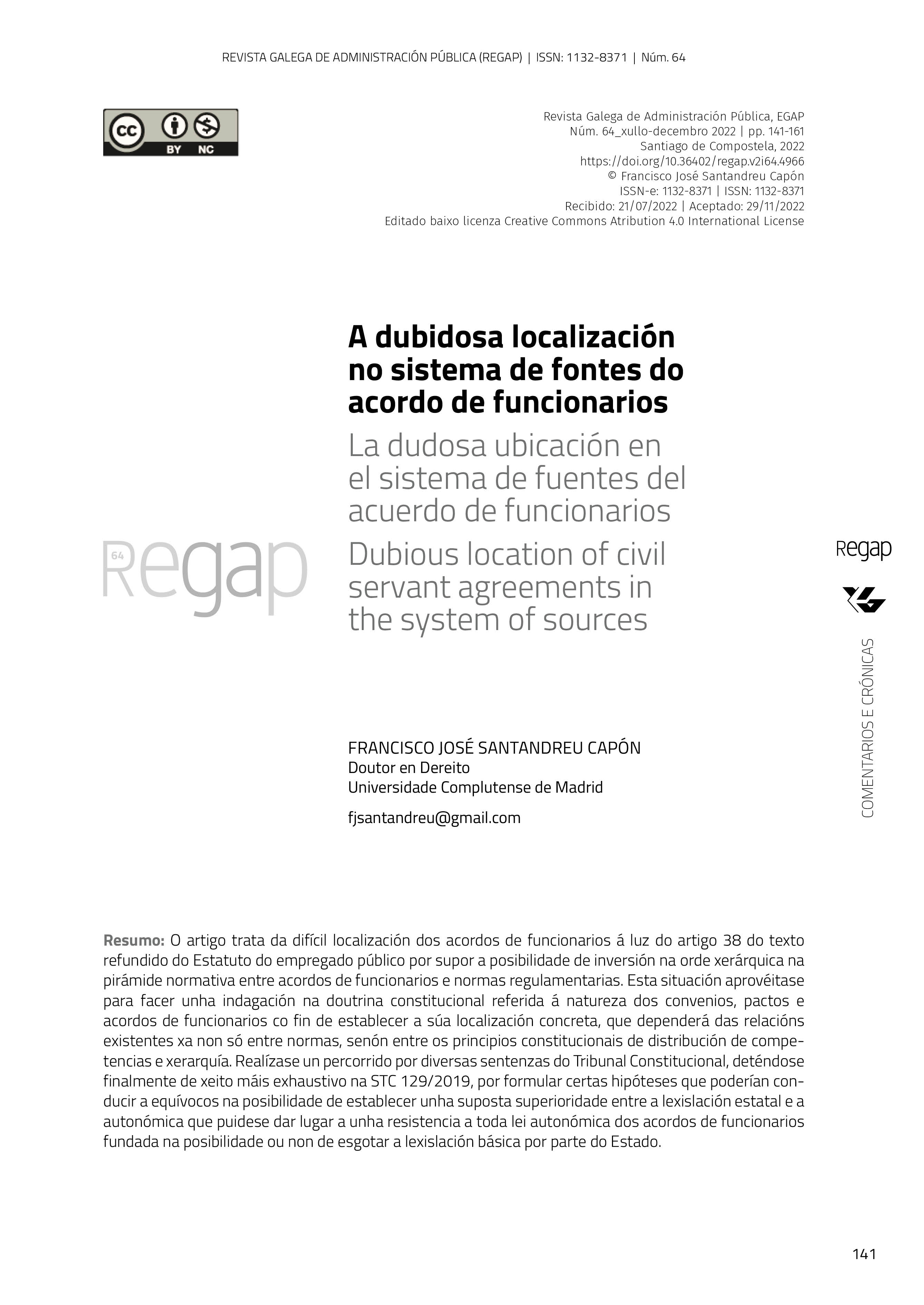 O artigo trata da difícil localización dos acordos de funcionarios á luz do artigo 38 do texto refundido do Estatuto do empregado público por supor a posibilidade de inversión na orde xerárquica na pirámide normativa entre acordos de funcionarios e normas regulamentarias. Esta situación aprovéitase para facer unha indagación na doutrina constitucional referida á natureza dos convenios, pactos e acordos de funcionarios co fin de establecer a súa localización concreta, que dependerá das relacións existentes xa non só entre normas, senón entre os principios constitucionais de distribución de competencias e xerarquía.