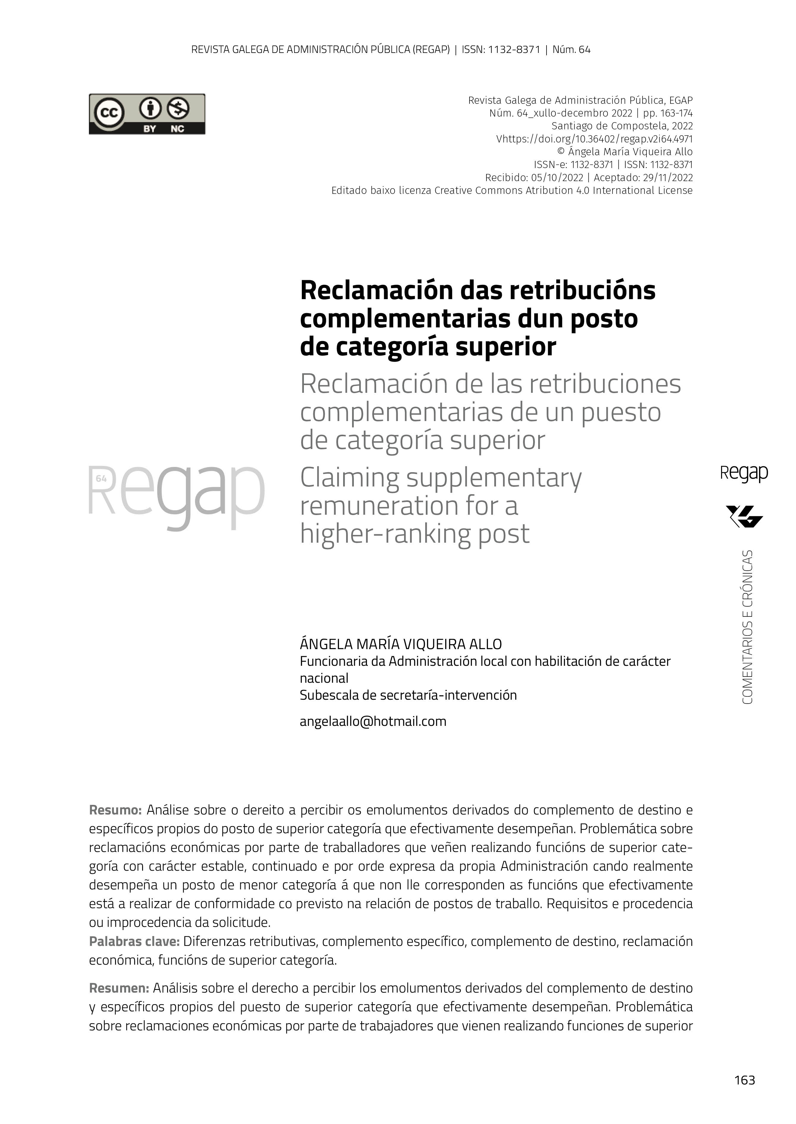 Análise sobre o dereito a percibir os emolumentos derivados do complemento de destino e específicos propios do posto de superior categoría que efectivamente desempeñan. Problemática sobre reclamacións económicas por parte de traballadores que veñen realizando funcións de superior categoría con carácter estable, continuado e por orde expresa da propia Administración cando realmente desempeña un posto de menor categoría á que non lle corresponden as funcións que efectivamente está a realizar de conformidade co previsto na relación de postos de traballo. Requisitos e procedencia ou improcedencia da solicitude.
