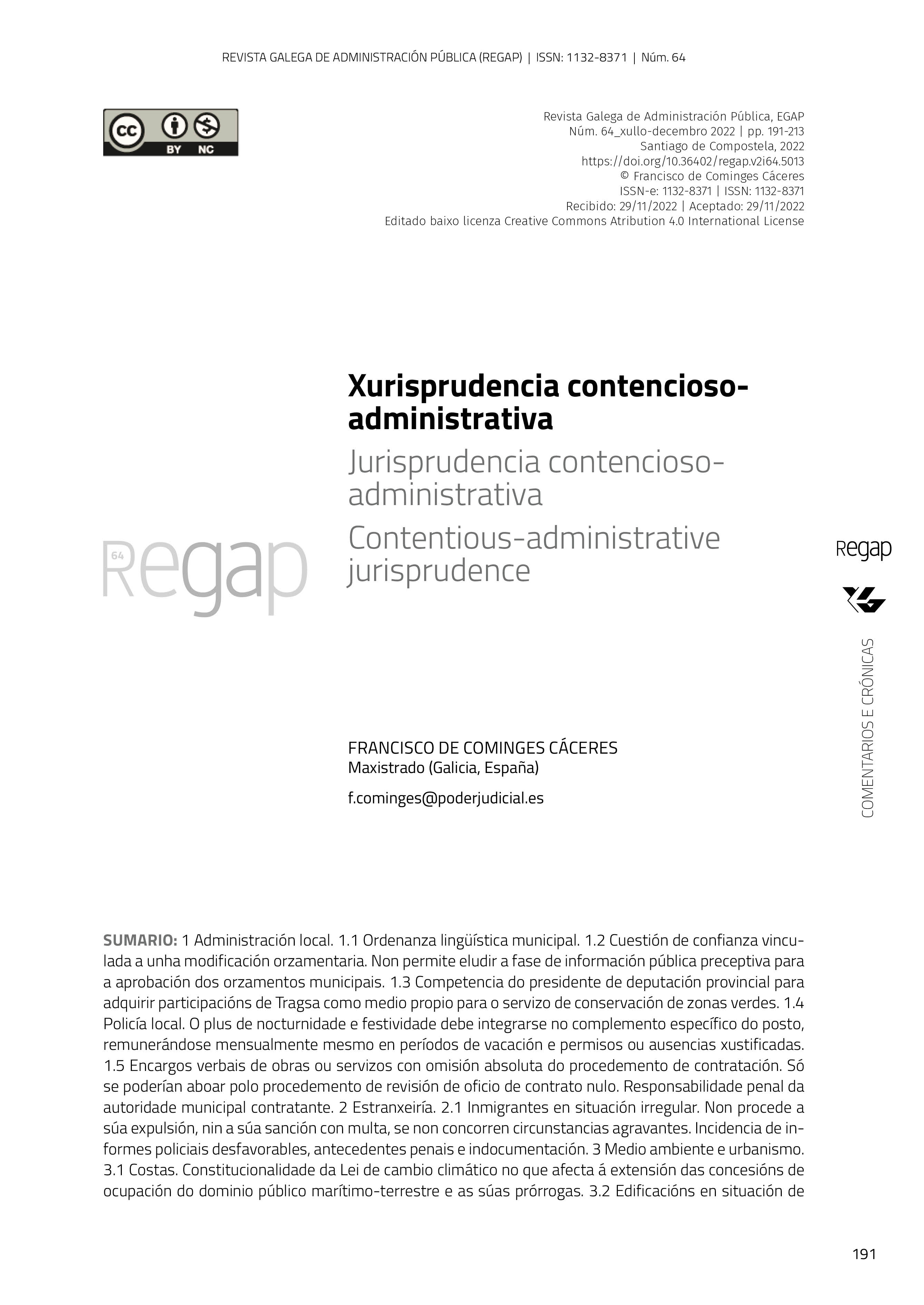 - Francisco De Cominges Cáceres, Xurisprudencia contencioso-administrativa , Revista Galega de Administración Pública: Núm. 63 (2022)