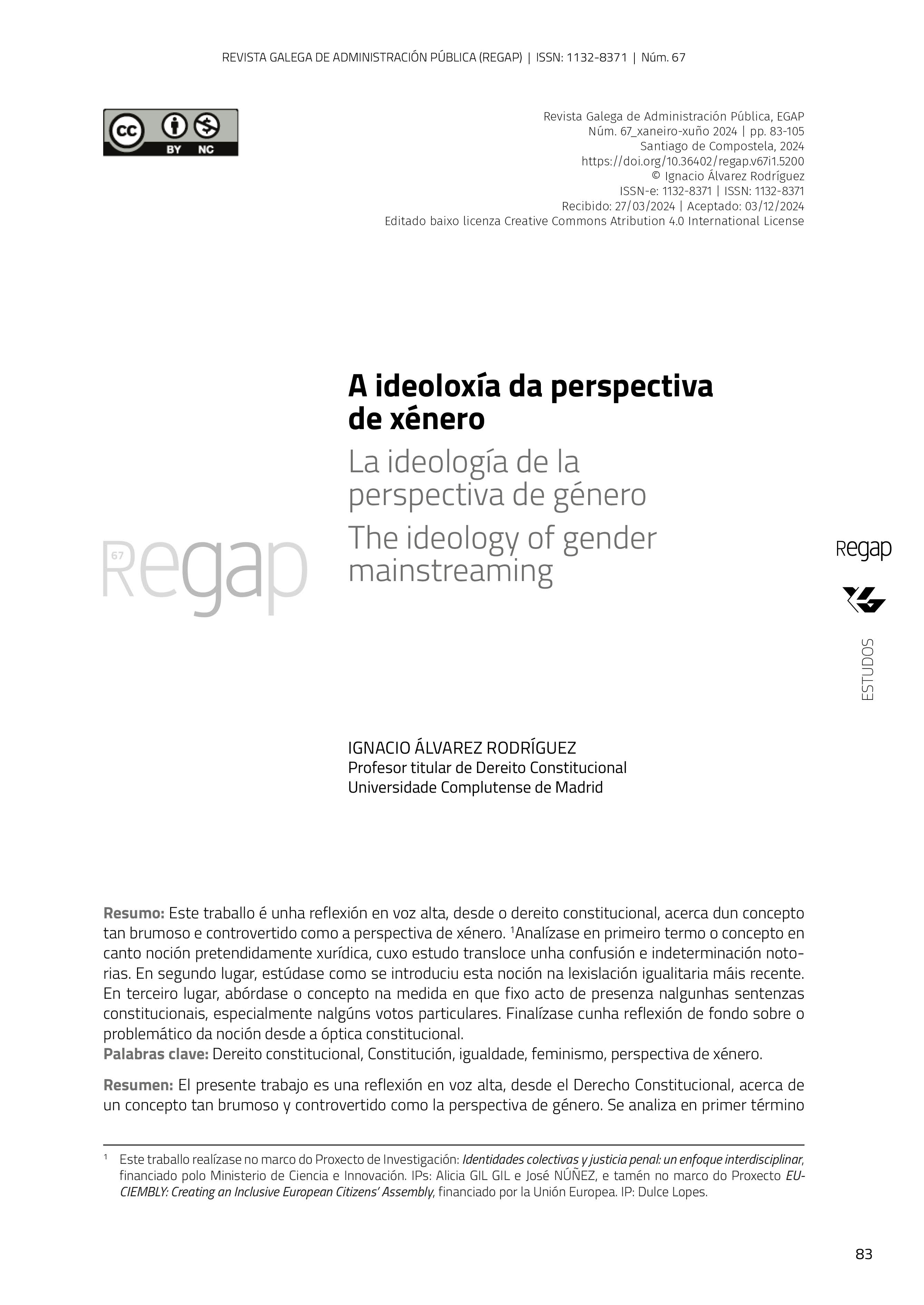 Este traballo é unha reflexión en voz alta, desde o dereito constitucional, acerca dun concepto tan brumoso e controvertido como a perspectiva de xénero. Analízase en primeiro termo o concepto en canto noción pretendidamente xurídica, cuxo estudo transloce unha confusión e indeterminación notorias. En segundo lugar, estúdase como se introduciu esta noción na lexislación igualitaria máis recente. En terceiro lugar, abórdase o concepto na medida en que fixo acto de presenza nalgunhas sentenzas constitucionais, especialmente nalgúns votos particulares. Finalízase cunha reflexión de fondo sobre o problemático da noción desde a óptica constitucional.