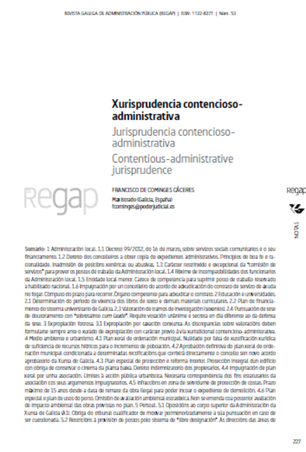 - Francisco de Cominges Cáceres, Xurisprudencia contencioso-administrativa (ano xudicial 2009-2010) , Revista Galega de Administración Pública: Vol. 1 Núm. 40 (2010)
