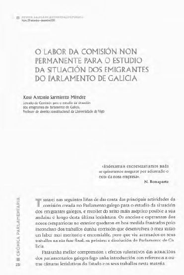 Intentaré en las siguientes líneas dar cuenta de las principales actividades de la comisión creada en el Parlamento gallego para el estudio de la situación de los emigrantes gallegos, y recopilar de la manera más aséptica posible su recorrido a lo largo de esta última legislatura. Las ansiedades y esperanzas de nuestros compatriotas en el extranjero se vieron en gran medida frustradas por el trabajo inacabado de un comité que, en mi opinión, realizó un trabajo muy meritorio y encomiable, pero que ha visto su trabajo en su fase final, ya cerca la disolución del Parlamento de Galicia