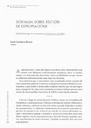 A expropiación é unha das figuras xurídicas máis impopulares que existen nos distintos ordenamentos xurídicos, pero ó mesmo tempo e en determinadas situacións a única posibilidade coa que contan as diferentes administracións para logra-los seus fins. Isto comporta que a súa xestión sexa complicada desde o punto de vista puramente persoal, ó intentar compaxinar intereses diversos e contrapostos, o que unido ó aínda máis complexo sistema que hai que seguir para consegui-lo fin, dea como resultado un lento e tedioso proceso non exento de innumerables situacións de difícil e nada rápida solución.