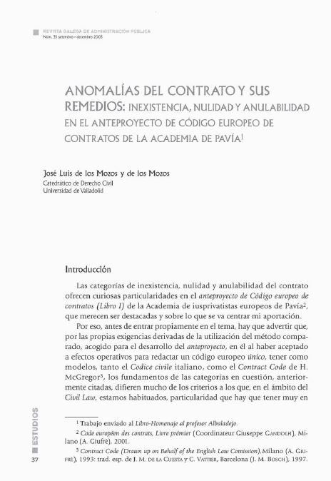 Anomalías do contrato e os seus remedios: inexistencia, nulidade, anulación no anteproxecto do código de contrato europeo da academia de pavia