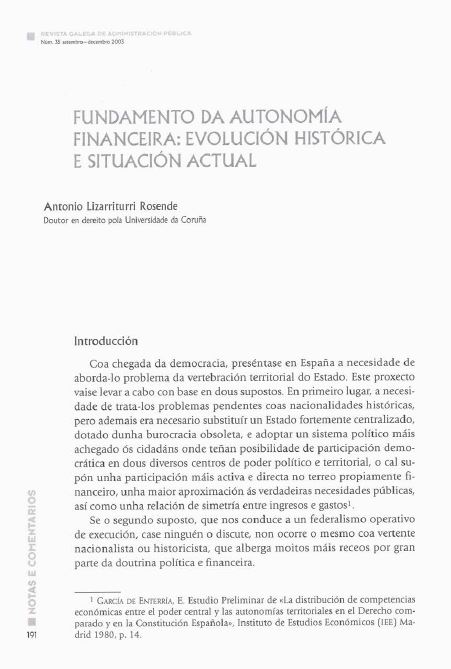 Fundamento da autonomía financeira: evolución histórica e situación actual
