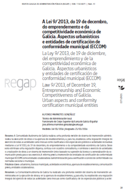 A Lei 9/2013, do 19 de decembro, do emprendemento e da competitividade económica de Galicia. Aspectos urbanísticos e entidades de certificación de conformidade municipal (ECCOM)
