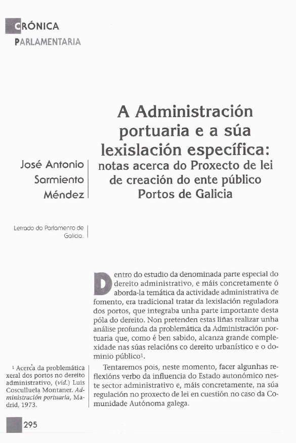 A Administración portuaria e a súa lexislación específica: notas acerca do Proxecto lei de creación del ente público Portos de Galicia